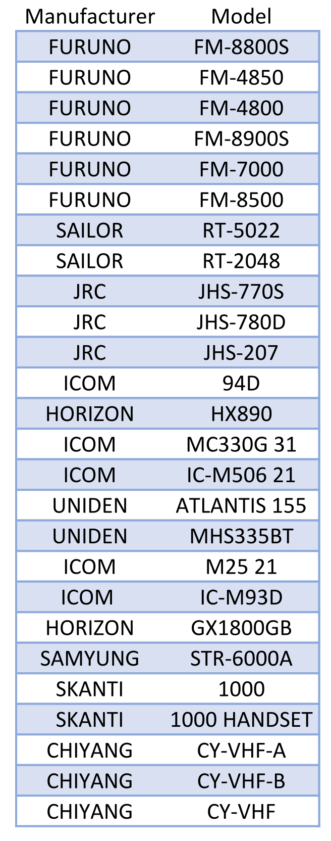 | Manufacturer | Model |